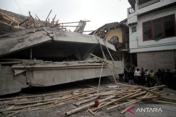 Santri melihat bangunan musala yang ambruk di Pondok Pesantren (Ponpes) Al Khoziny di Kecamatan Buduran, Sidoarjo, Jawa Timur, Senin (29/9/2025). Belum diketahui jumlah korban yang yang tertimbun akibat ambruknya bangunan tersebut. ANTARA FOTO/Umarul Faruq/agr