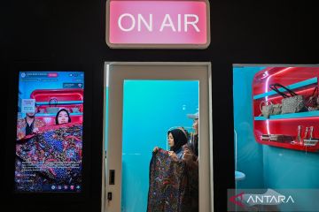 Pedagang menawarkan produk batik melalui siaran langsung di salah satu aplikasi lokapasar di stan Tokopedia dan Tiktok Shop pada pameran INACRAFT 2025 di Jakarta Convention Center (JCC), Jakarta, Jumat (3/10/2025). Kegiatan tersebut sebagai bentuk dukungan terhadap produk kerajinan batik lokal dalam kampanye #MelokalDenganBatik sekaligus mengajak masyarakat untuk membeli produk dalam negeri. ANTARA FOTO/Fauzan/agr