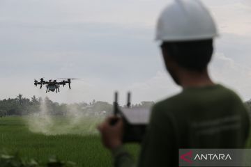 Operator dari Maxxi Tani menerbangkan pesawat tanpa awak atau drone untuk menyemprotkan pestisida di area persawahan Desa Tanara, Kecamatan Tanara, Kabupaten Serang, Banten, Rabu (1/10/2025). Kelompok tani Sukamaju, Desa Tanara mulai menggunakan teknologi drone pertanian untuk penyemprotan pestisida sebab dinilai lebih efektif dan efisien jika dibandingkan cara konvensional karena hanya membutuhkan waktu rata-rata 15 menit untuk satu hektare lahan dengan tarif Rp550 ribu-Rp600 ribu termasuk larutan pestisida per hektarenya. ANTARA FOTO/Angga Budhiyanto/agr