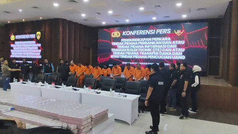 Sejumlah tersangka dihadirkan dalam pengungkapan kasus pembobolan rekening dormant di Jakarta, Kamis (25/9/2025).