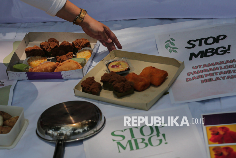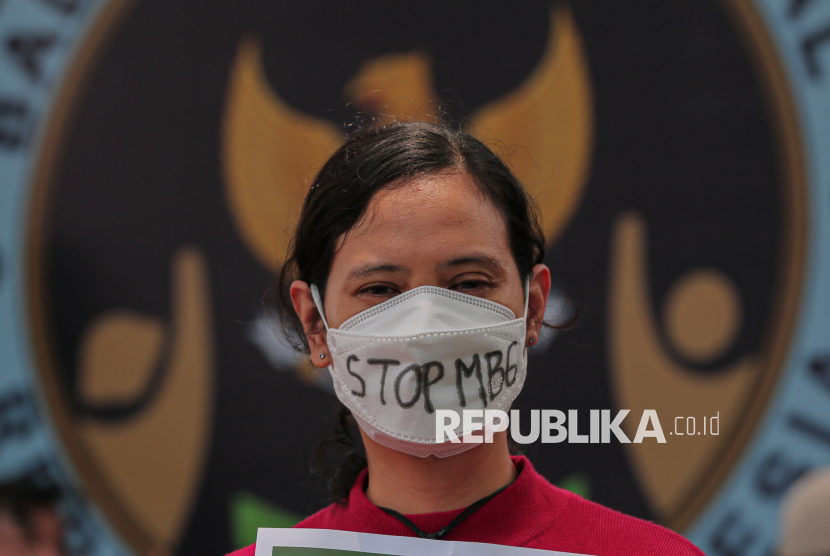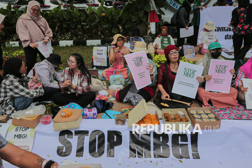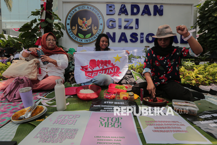 Peserta aksi yang tergabung dari Suara Ibu Indonesia menggelar aksi Tolak MBG di depan Gedung Badan Gizi Nasional (BGN), Jakarta, Rabu (15/10/2025). Dalam aksinya mereka menyuarakan penolakan terhadap program Makan Bergizi Gratis (MBG) yang digagas pemerintah setelah banyak kasus korban keracunan di berbagai daerah. Mereka menuntut pemerintah untuk segera mengevaluasi secara menyeluruh program tersebut. Diantaranya penyaluran MBG dilakukan secara bertahap dan dimulai dari keluarga pra-sejahtera agar tepat sasaran, prioritas penyaluran MBG kepada keluarga di desa dan perkotaan yang rentan krisis pangan dan gizi hingga transparansi program yang melibatkan masyarakat sipil sebagai pengawas independen untuk meminimalisir praktik KKN dalam program tersebut. (FOTO : Republika/Thoudy Badai)