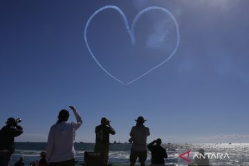 Warga menyaksikan atraksi pesawat di udara saat pertunjukan aerobatik Pacific Airshow di Kota Huntington Beach, Orange County, California, Amerika Serikat, Jumat (3/10/2025). Pacific Airshow merupakan salah satu pertunjukan aerobatik kelas dunia. ANTARA FOTO/Xinhua/Qiu Chen/agr