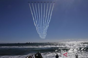 Pesawat melakukan atraksi di udara saat pertunjukan aerobatik Pacific Airshow di Kota Huntington Beach, Orange County, California, Amerika Serikat, Jumat (3/10/2025). Pacific Airshow merupakan salah satu pertunjukan aerobatik kelas dunia. ANTARA FOTO/Xinhua/Qiu Chen/agr